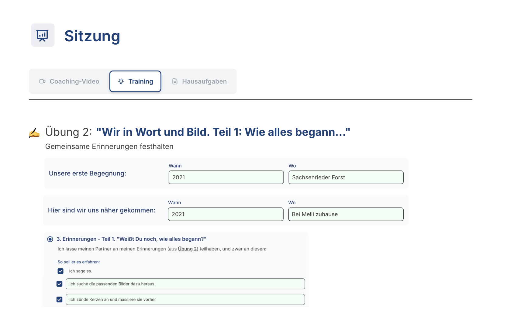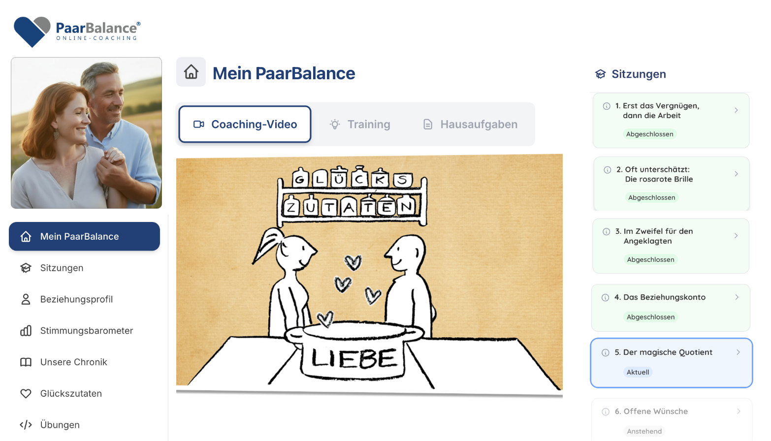 Das umfangreiche Angebot besteht aus einem kostenfreien, wissenschaftlich fundierten Partnerschaftstest mit ausführlicher Stärken-Schwächen-Analyse sowie einem kostenpflichtigen Coaching-Programm mit zahlreichen Motivationshilfen. Pointiert und humorvoll wird in 18 Online-Sitzungen das nötige Rüstzeug vermittelt, um Konflikte zu bewältigen, Herausforderungen zu meistern und die Liebe zwischen den Partnern (wieder) zu stärken.